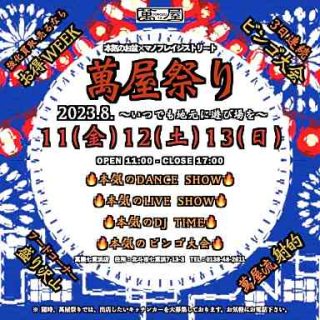 イベント 萬屋祭り 8月11日(金)~8月13日(日) 2023年8月11日(金)~13日(日)【萬屋祭り】フードコーナー盛り沢山で、ビンゴ大会や DANCE SHOW などのお祭りを開催! おやこキッズ見る食べる 2023.08.07 おやこイベントキッズ