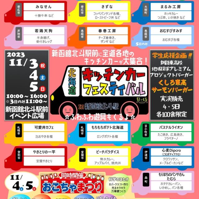 イベント 北海道キッチンカーフェスティバルIN新函館北斗駅 11月3日(金)~11月5日(日) 2023年3日(金祝)4日㈯5日㈰【北海道キッチンカーフェスティバルIN新函館北斗駅】が開催♪新函館北斗駅前に全道各地のキッチンカーが大集合します! おやこ遊び食べる 2023.11.02 おやこイベント