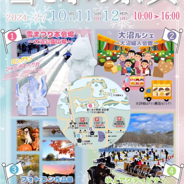 イベント 第58回大沼函館 雪と氷の祭典 2月10日(土)~2月12日(月) 2024年2月10日(土)~12日(祝月)【第58回大沼函館 雪と氷の祭典】が開催されます♪結氷した大沼湖から氷を切り出して作る「ジャンボすべり台」は毎回子供から大人まで大人気。 おやこ遊び食べる 2024.01.30 おやこイベント