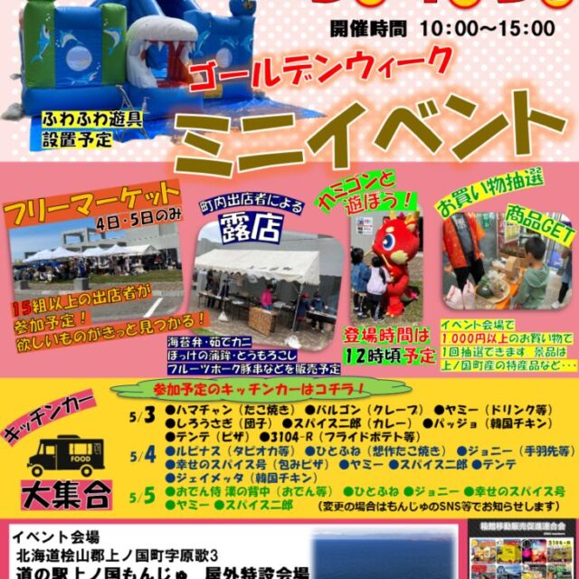 イベント 【道の駅 上ノ国もんじゅ】ゴールデンウイークミニイベント 5月3日(金)~5月5日(日) 2024年5月3日~5日【道の駅 上ノ国もんじゅ ゴールデンウイークミニイベント】毎年恒例の上ノ国町内出店者の露店、フリーマーケット(5/4・5/5のみ)を開催! おやこショッピング遊び食べる 2024.05.01 おやこイベント