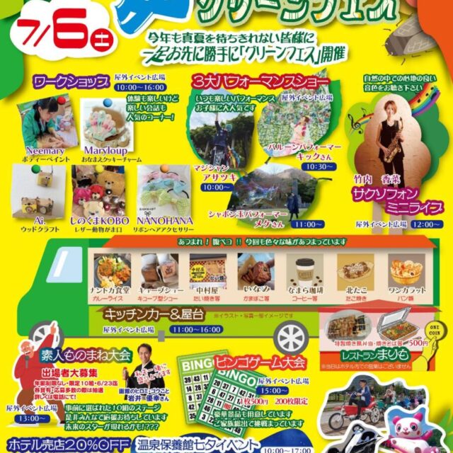 イベント 第2回 夏を先取り!グリーンフェス!! 7月6日(土) パフォーマンス・グルメ・ワークショップなど、お子さんも一緒に楽しめるイベントが満載! おやこ体験見る遊び食べる 2024.06.13 おやこイベント