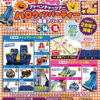 イベント ふわふわアドベンチャーツアーハロウィンパーティーinアリーナ 10月14日(土)~10月15日(日) 2023年10月14日(土)15日(日)【ふわふわアドベンチャーツアーハロウィンパーティーinアリーナ】遊びがたくさん!ふわふわで楽しもう! おやこ体験遊び遊具食べる 2023.09.01 おやこイベント