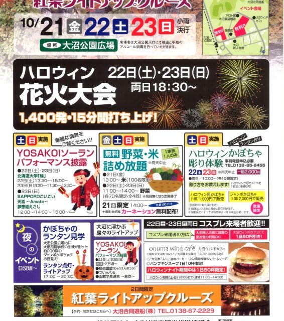イベント 第11回 大沼ハロウィンナイト&紅葉ライトアップクルーズ 10月21日(金)~10月23日(日) 2022年10月21日(金)22日(土)23日(日)【第11回 大沼ハロウィンナイト&紅葉ライトアップクルーズ】が開催されます♪ジャンボかぼちゃのランタンが大沼公園を幻想的にライトアップ! おやこ2022ハロウィンショッピング体験見る食べる 2022.10.05 おやこイベント